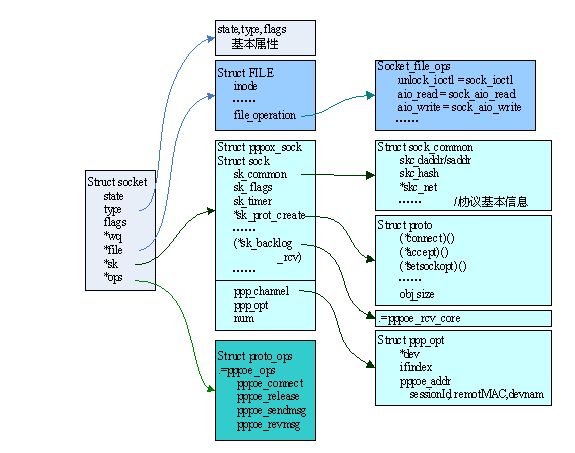 在协议栈中,主要是socket特有的proto_ops操作,但对于一些复杂的协议,如TCP,还需要其它一些操作来支持,这些接口都放在struct sock中的struct proto中。PPPOE协议比较简单,不需要struct proto的操作来支持,但其中的obj_size仍然重要,如前所述。