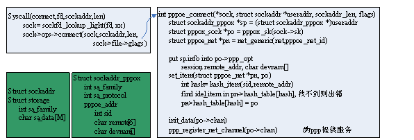 再看pppoe_connect中,首先由sock结构指针得到pn指针,它们是分配在一起的(如前所述),这很容易得到,同时还得到pppoe_net结构的指针(它是该协议中全局共有的)。然后把用户传递进来的addr的数据放到socket中来,并且执行一个set_item函数,该函数主要根据addr信息,把该socket指针放到协议全局的pppoe_net结构中(这一步对接收过程很重要,后面会细讲)。最后初始化了该socket中特有的chan结构,并调用ppp_register_net_channel(),这主要为ppp服务,以后再看。