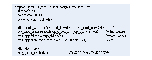 首先从sock中获得相关信息,最重要的当然是dev设备,因为pppoe的设备是选定的(由useraddr提供),而有些协议如IP,则会根据协议地址,有协议栈自动选择dev。然后分配skb,并准备其中的package,这是每个协议的关键,由于pppoe协议很简单,只需要设置好一个pppoe header即可。最后直接调用dev_queue_xmit(skb),通过设备将该package发送出去。
