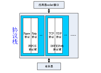 这里想讲一下的是,pppoe到底是什么层的协议,链路层。而通过上面的描述,更准确的说法应该是,pppoe是一个完整的协议,是从应用层到设备之间的协议模块,从这个意义上来讲,它和INET域中的协议是等价的。如下图所示: