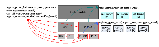 首先内核有个全局结构net_generic,其中一个最重要的元素是指针数组。然后每个协议module加载时,会调用register_pernet_device(struct pernet_operations*)(见第一节图),pernet_operations结构中最关键的两个参数,一个是size,它指示内核为该模块分配一个私有数据结构(如pppoe即为struct pppoe_net),另一个是xx_net_id,它指示由net_generic.ptr[xx_net_id]来指向该数据结构,这样每个协议模块中,就可以根据自己的xx_net_id很容易寻找到内核分配给自己的私有结构。最后协议的私有模块中一般也有一个指针数组,用以索引属于它的各个socket。