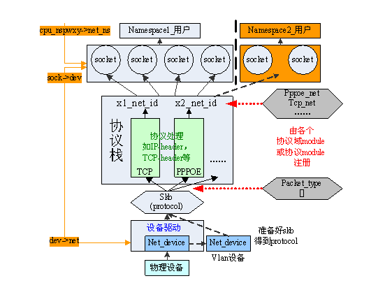 先不看橙色部分,一个接收流程由物理设备的中断触发,设备驱动程序进行相应处理,得到协议栈中标准的数据结构sk_buff(简称skb),并根据一个特殊的全局数据结构packet_type,将数据交给相应的协议;协议根据自身设计特点对skb数据进行处理,并通过全局变量xx_net_id和各个协议私有的特殊数据结构xx_net,寻找到该数据包对应的应用层socket插口,并将其放在该socket插口的接收队列中;最后应用层在某个时刻会通过read系统调用读取该数据(如第3节所讲)。