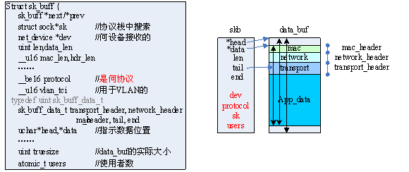 准备skb结构。首先来看一下sk_buff的构成,如下图所示。Skb只是一个控制结构,实际的数据放在一个data_buf中,并由skb中一些列参数索引,具体见下图右所示,这之中有些参数是在分配data_buf、copy数据时就决定的,如head、end、data、tail等;有些则要经过一定的识别才能得到,如mac_header一般在设备驱动中得到,而network_header、transport_header则要到协议栈中才知道,且各个协议的处理各不相同,如PPPOE协议根本不需要只需要指明network_header,而TCP协议则有复杂的头部信息。最终由skb->data指针和头部长可得到app_data的位置,因此应用层可以只读取应用数据即可。