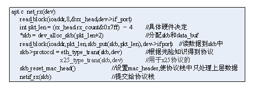 设备驱动程序只关心mac_header,即数据包最初始的部分。前面也提到了,这需要一定的先验知识,如ethernet设备驱动,它先验的指导以太网头部由DMAC、SMAC和两字节的协议构成,下面是一个RTL8012驱动的接收片段(~/dev/net/Ethernet/realtek/apt.c):