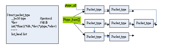 系统中所有全局的packet_type构成一个list,并由全局变量ptype_all索引,另外还提供ptype_base[]全局数组,将type相同的packet_type单独成链,为遍历提供方便。