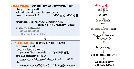 可以看到pppoe协议的处理过程几乎没有,仅是设置了skb的network_header, transport_header,然后就利用get_item()函数找到它所属的socket插口,直接把它提交给上层。如上图右所示,是典型的TCP接收流程,是相当复杂的,其中TCP与IP的接头处还需用到额外的私有数据结构。