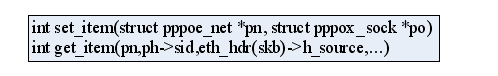 就不看细节了,仅看两个函数的原型就能明白,其中pn参数就是上面所述的用全局结构net_generic和各协议私有xx_net_id获得的。Set_item()函数在connect时调用(参见第3节),它根据pppox_sock中的sessionID、remoteMAC(这两个参数由*useraddr传入,详见下一篇协议分析),根据一个hash算法得到一个hashInt值,然后用pn->hash_ptr[hashInt]指向该socket结构。那反过来,接收时由这两个参数(由数据包的协议头中获得)得到hashInt,便能很容易找到对应的socket了。