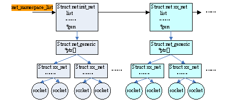 network的命名空间问题主要在于,每个协议模块的xx_net私有结构不仅是一个,而是由内核全局决定的,即每注册一个新的用户(有点像虚拟机机制),就分配一个新的xx_net结构,这样多用户间可以用参数相同的socket连接,但却指向不同的socket。