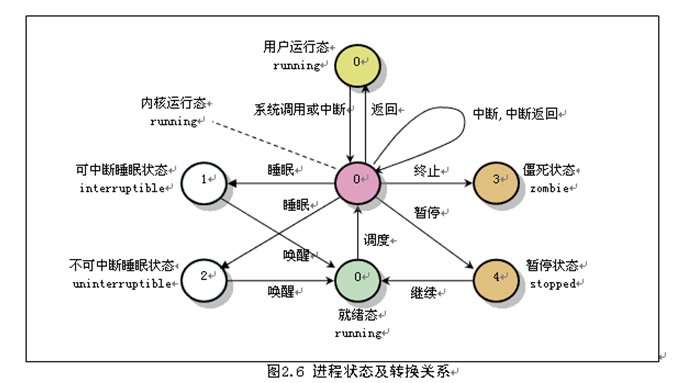 暂停状态(TASK_STOPPED):进程暂停执行接受某种处理。如正在接受调试的进程处于这种状态,Linux 使用TASK_STOPPED 宏表示此状态。