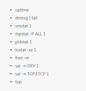 有些命令需要安装 sysstat 工具包。这些命令展示的指标会帮助你完成一些 USE(Utilization,Saturation,Errors) 方法:定位性能瓶颈的方法论。包括了检查使用率(Utilization),饱和度(Saturation),所有资源(比如 CPU,内存,磁盘等)的错误指标(Errors)。同样也要关注你什么时候检查和排除一个资源问题,因为通过排除可以缩小分析范围,同时也指导了任何后续的检查。