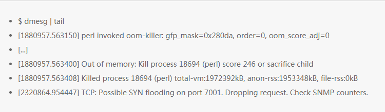 这里展示的是最近 10 条系统消息日志,如果系统消息没有就不会展示。主要是看由于性能问题导致的错误。上面这个例子中包含了杀死 OOM 问题的进程,丢弃 TCP 请求的问题。