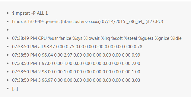 这个命令分打印各个 CPU 的时间统计,可以看出整体 CPU 的使用是不是均衡的。有一个使用率明显较高的 CPU 就可以明显看出来这是一个单线程应用。