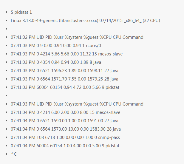 pidstat 命令有点像 top 命令中的为每个 CPU 统计信息功能,但是它是以不断滚动更新的方式打印信息,而不是每次清屏打印。这个对于观察随时间变化的模式很有用,同时把你看到的信息(复制粘贴)记到你的调查记录中。