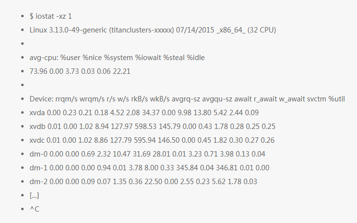 这个工具对于理解块设备(比如磁盘)很有用,展示了请求负载和性能数据。具体的数据看下面字段的解释: