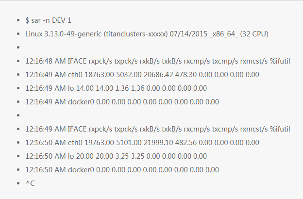 这个版本的工具还有一个统计字段: %ifutil,用于统计设备利用率(全双工双向最大值),这个利用率也可以使用 Brendan 的 nicstat 工具来测量统计。在这个例子中 0.00 这种情况就似乎就是没有统计,这个和 nicstat 一样,这个值是比较难统计正确的。