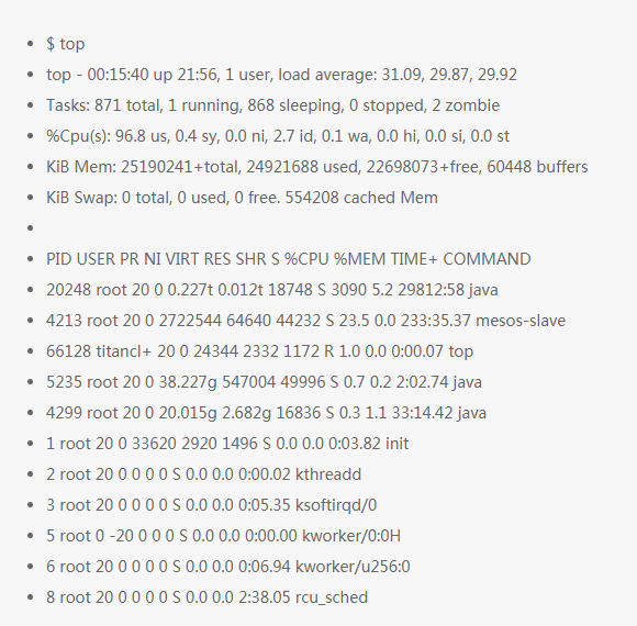 在上面的例子中,平均负载显示是在不断增加的,1 分钟的值是 30,相比 15 分钟的值 19 来说是增加了。这个数字这么大就意味着有事情发生了:可能是 CPU 需求;vmstat 或者 mpstat 会帮助确认到底是什么,这些命令会在本系列的第 3 和第 4 个命令中介绍。