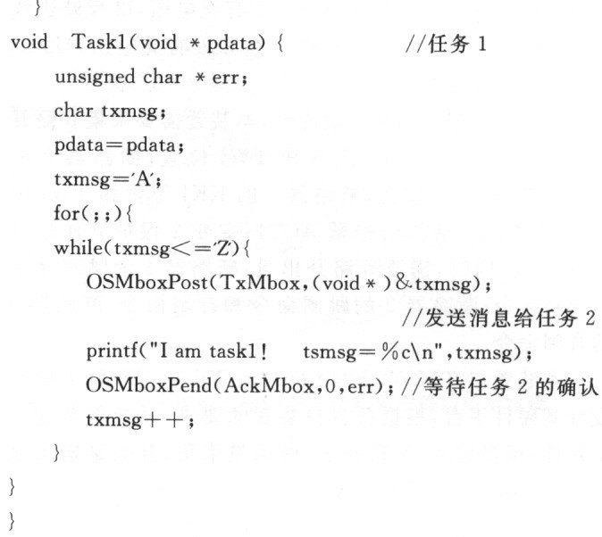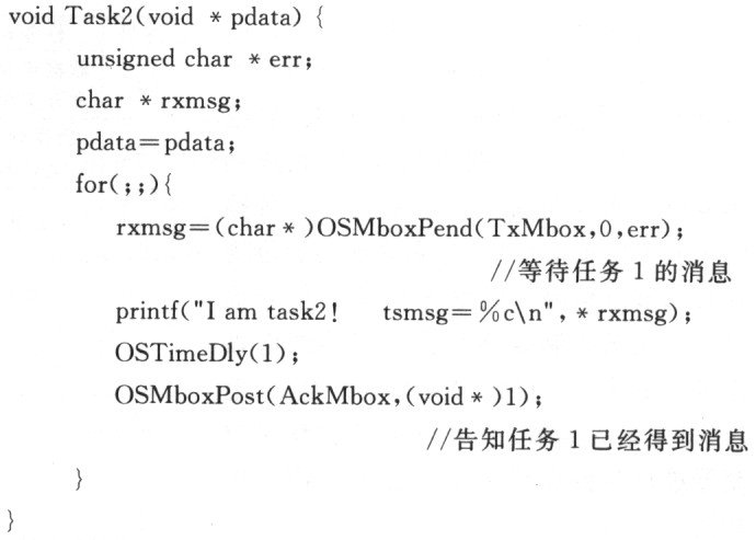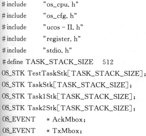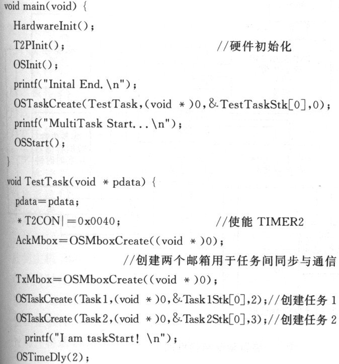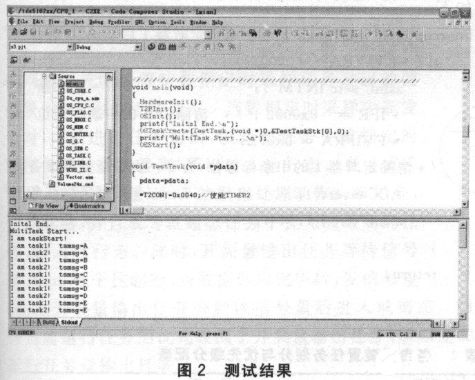 首先,修改与TMS320F240相关的文件OS_CPU.H、OS_CPU_A.ASM和OS_CPU_C.C,再加上其公开的系统源代码,将它们一起拷入指定的文件目录,系统的移植就完成了。系统移植成功后,需要对操作系统进行裁剪,把用不到的功能去掉,以最大限度地节省存储空间。这项工作是通过OS_CFG.H中的宏定义进行的,本文用到多任务管理、信号量、互斥量等功能。在本应用中,μC/OS_II内核经过剪裁后只有2 KB左右,相对TMS320F240的16 KB内部程序FIash只用了不到八分之一。下面是测试内核能否正常工作的应用程序。测试结果如图2所示,表明移植成功。