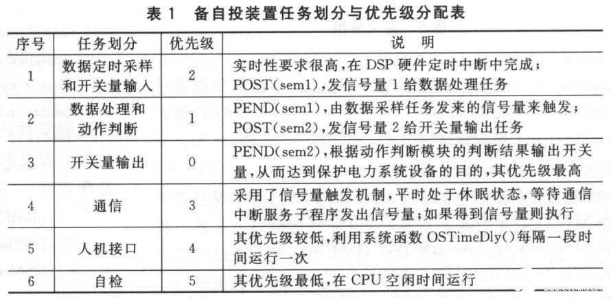 本文采用μC/OS-II作为软件平台的操作系统,它是一种优先级占先式内核,具有多任务的实时调度能力,更加适合管理DSP丰富的外设资源,从而更好地发挥其高效的运算性能,满足备自投装置实时性、可靠性等要求。