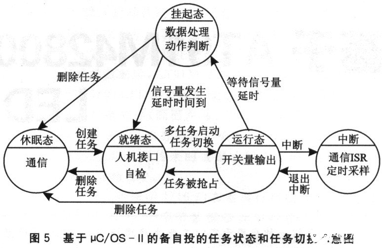 μC/OS-II中,每个任务都处于休眠态、就绪态、运行态、挂起态和中断态5种状态之一。如图5所示,当前运行的是开关量输出任务,数据处理动作判断任务因为等待数据定时采样任务发出的信号量seml而处于挂起态。当数据定时采样中断发生时,内核进行任务切换,就绪态任务中数据定时采样任务优先级最高,所以进入运行态。当完成采样时,发出信号量selnl给数据处理动作判断任务,使其就绪,并且成为就绪态任务中优先级最高的任务,转入运行态。此时,开关量输出任务等待信号量sem2处于挂起态,当数据处理完毕后,发信号量sem2,开关量输出任务得到该信号量后进入就绪态。因为当前运行任务的优先级低于开关量输出任务,所以立即运行开关量输出任务。