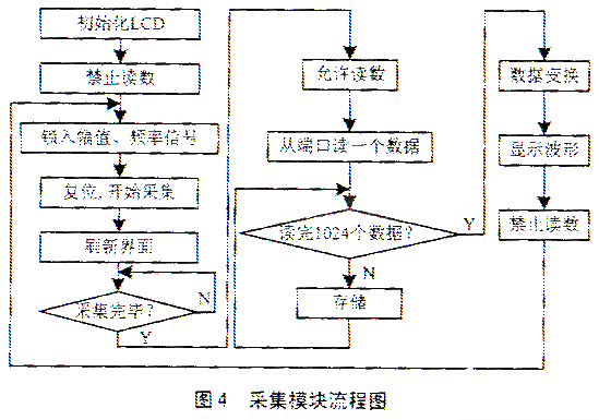 系统首先向采集卡发送所要求的频率和幅值信号,然后发出复位信号RESET,采集卡开始采集数据。采集到的数据经过FIFO存储器,由J口读入内存并存入指定数据缓冲区之中。在存储过程中,采用了双缓冲区机制,数据按1K大小分块,相邻的两块数据交替存放在内存的不同区域中。在每读入1K个数据之后,内存中都存在连续的2K个采样数据,这样有助于以后对数据的处理和显示。