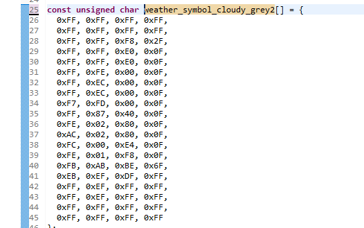 网络上有许多位图到数组的转换器。比如:https://lvgl.io/tools/imageconverter。最终,我们得到一个看起来像这样的数组: