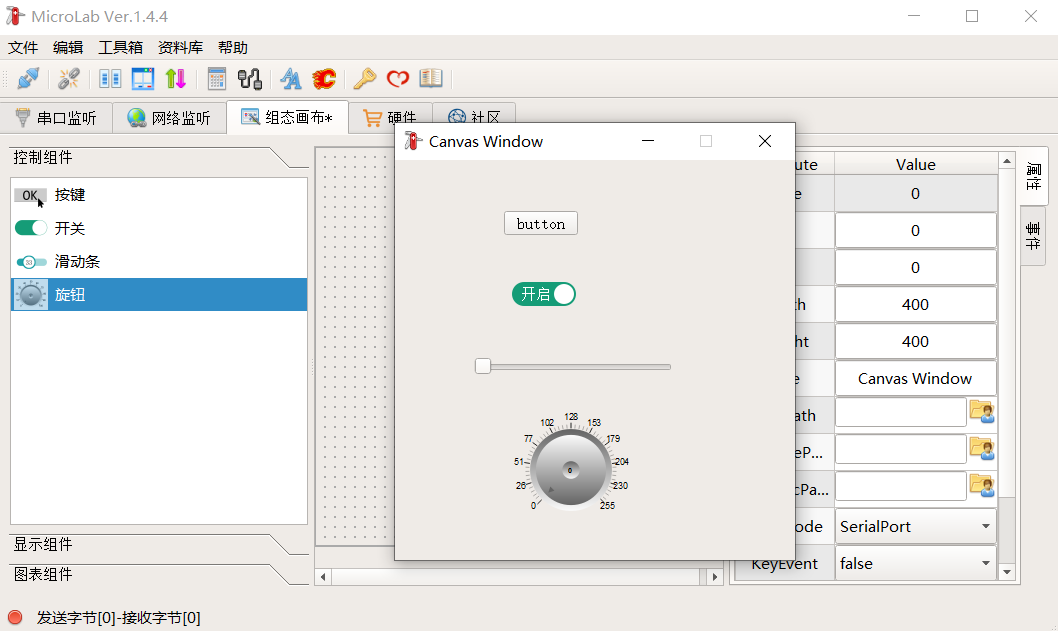 切换到组态画布页面,然后手动将左边相关控件拖放到中间控件放置区域,选中其中一个控件时,可以通过右边更改控件的属性,和玩串口屏是类似的操作,即使完全没有用过,不看说明文档也能快速上手。当控件布局完毕以后,在控件放置区域点击鼠标右键选择Run,这时候就会弹出刚刚画好的界面,如下: