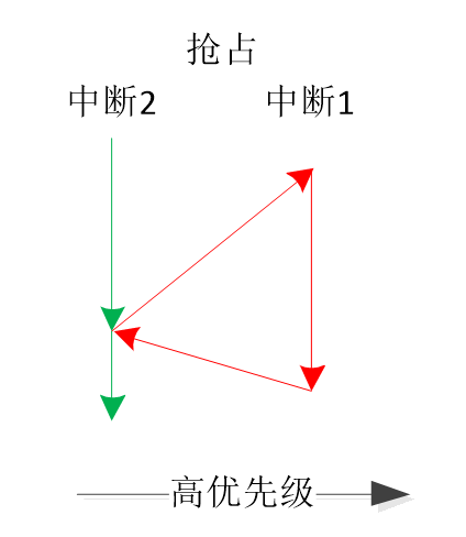 抢占优先级,即如果中断 1 的优先级比中断 2 的抢占优先级高的话,一旦中断1发出中断请求,即使已经在中断 2 执行了,也会强制进入中断 1 执行,这个类似于 main 函数与中断的关系,只不过这里两个都是中断而已。