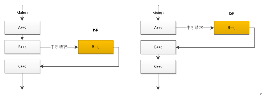 但是善于分析的道友可能会提出这样一个疑问,为什么上面只考虑了main 函数中的B++被打断的可能,却没有考虑中断(橙色部分)的B++被打断的可能,是鱼鹰忽略了吗?