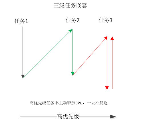 那么比任务1 和任务 2 优先级更高的任务该什么时候执行呢?答案是随时,即只要高优先级任务有需要,那么不管任务 1 和 任务 2 是否主动释放 CPU,都会被操作系统强制切换到高优先级任务中执行(由 Systick完成,所以可能会有一点延时)。