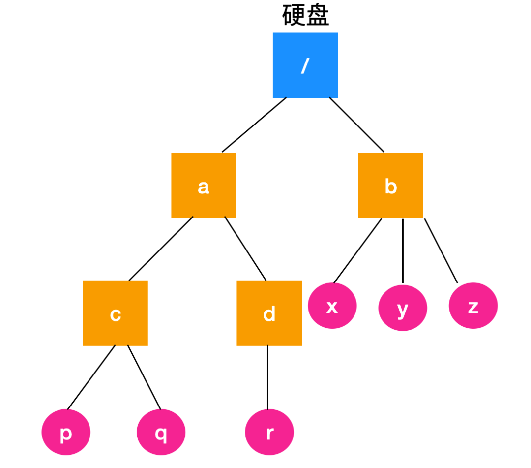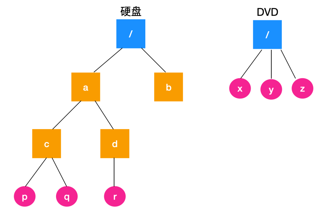 而在 Linux 中,是支持挂载的,它允许一个磁盘挂在到另外一个磁盘上,那么上面的关系会变成下面这样