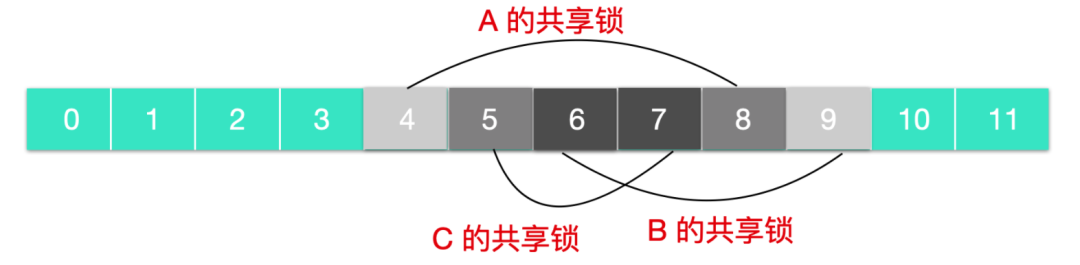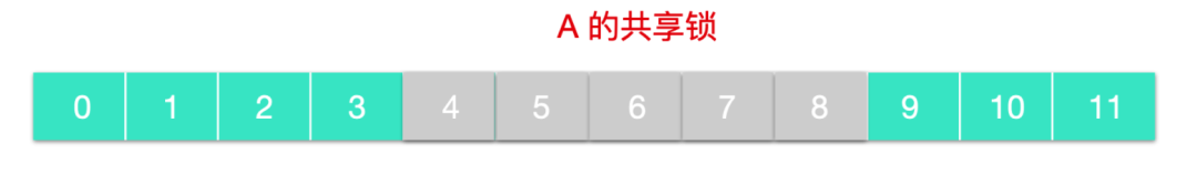 如上图所示,A 的共享锁在第四字节到第八字节进行加锁