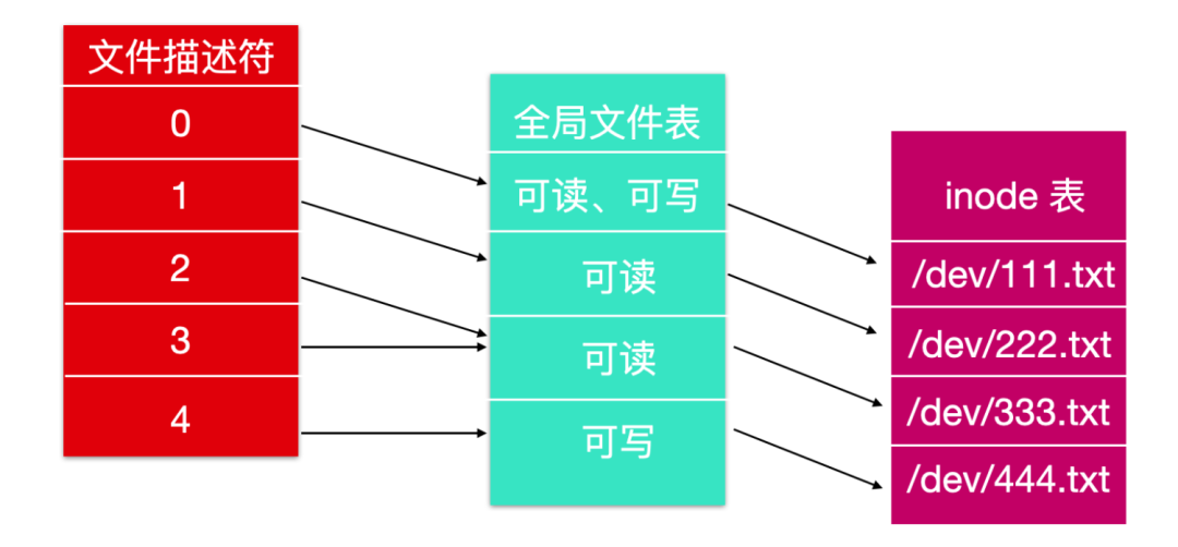 当一个进程成功访问一个打开的文件时,内核会返回一个文件描述符,这个文件描述符指向全局文件表的 entry 项。这个文件表项包含文件的 inode 信息,字节位移,访问限制等。例如下图所示