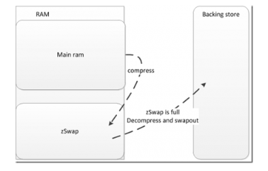 zSwap是在memory与flash之间的一层“cache”,当内存需要swap出去磁盘的时候,先通过压缩放到zSwap中去,zSwap空间按需增长。达到一定程度后则会按照LRU的顺序(前提是使用的内存分配方法需要支持LRU)将就最旧的page解压写入磁盘swap device,之后将当前的page压缩写入zSwap。