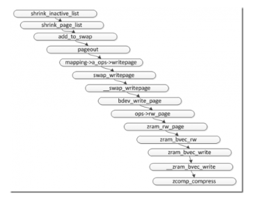 内存回收过程路径进行内存压缩。会将非活跃链表的页进行shrink, 如果是匿名页会进行pageout, 由此进行内存压缩存放到ZRAM中, 调用路径如下: