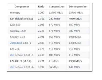 目前比较主流的内存算法主要为LZ0, LZ4, ZSTD等。下面截取了几种算法在x86机器上的表现。各算法有各自特点, 有以压缩率高的, 有压缩/解压快的等, 具体要结合需求场景选择使用。