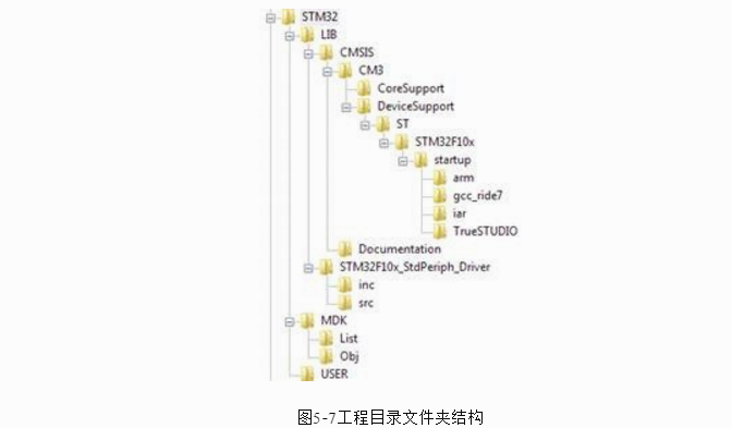 首先先建立一个用于存放工程的文件夹,此处命名为STM32;在文件夹下分别建立LIB、USER、MDK三个文件夹,分别用于存放标准外设库文件、用户程序文件、工程目录。