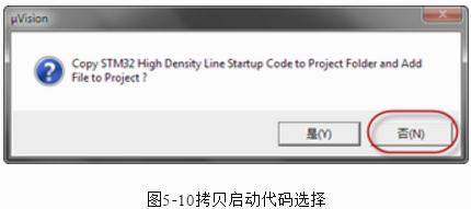芯片选择完成后软件会弹出一条提示,提示是否要拷贝STM32大容量启动代码并添加到工程,由于我们使用新版本标准外设库中提供的启动代码,因此此处选择否。如图4所示。