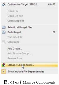 在左侧Project一栏中对Target 1两次点击之后可以重命名,这里命名为STM32,然后右击,如所示,单击Manage Comoonents。出现如所图5示界面。