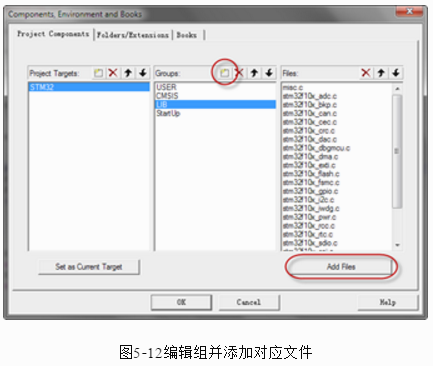 在这个界面里可以更为方便的添加工程的相关文件。也可以在对应的Group上右键Add Group和Add Files to Group只是这种方式更方便集中的添加和管理。按照图6所示,建立四个Group,点击Groups一栏右上角图标,依次新建USER、CMSIS、LIB、StartUp四个组,点击对应的组在点击右下方Add Files添加相应的文件到对应的组中。