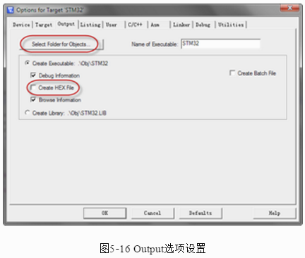 在如图10所示Output选项卡中主要注意两项,一是选择输出文件夹,选择之前工程目录中MDK文件夹下的Obj文件夹,在下面还有一个Create HEX File选项,用于选择是否生成hex文件,如果编译好的程序要写片,或者要提供给别人下载到芯片中而不希望别人知道源码时可以提供HEX文件。