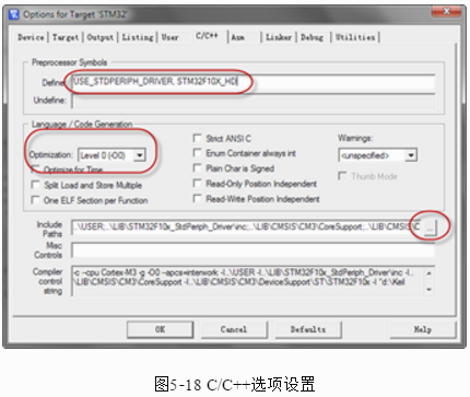 C/C++选项卡中的设置比较重要,如图12所示,选项卡中主要有两个地方需要注意,首先是整个工程的宏定义,在前面标准外设库部分已经有过介绍,标准外设库中很多功能都是通过宏定义来实现的,由于标准外设库针对STM32一系列芯片,因此需要通过宏定义来进行针对性的选择。这种选择有两种方式,有的人是直接改动宏定义部分的库文件,缺点是需要更改一些功能时不是很方便,而且笔者建议在尽量不更改库文件的方式下实现功能的配置和使用,另一种方式就是在工程的设置中添加宏定义,这儿添加了两个宏定义,USE_STDPERIPH_DRIVER表示使用标准外设库进行程序开发,STM32F10X_HD表示使用的是STM32F10X系列大容量器件,本例中中使用的是STM32F103ZET6故填写此项。