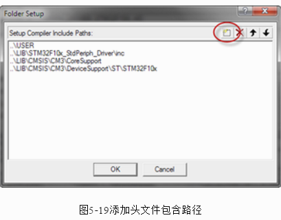 接下来一个重要的设置就是设置工程所包含的头文件目录,如图13所示,点击Include Paths一栏右侧图标,弹出如所示的对话框。点击对话框右上角图标,添加工程所包括的头文件路径,添加头文件路径的时候要把当前工程目录中包含头文件的路径都添加进去,如所示,添加了以下几个路径: