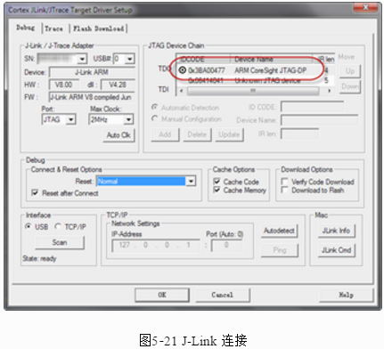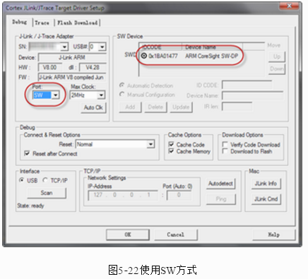 STM32F10X内核集成了串行/JTAG调试接口SWJ-DP(Serial Wire and JTAG)。这是标准的ARM CoreSight调试接口,包括JTAG-DP接口(使用5个引脚)和SW-DP(使用两个引脚)。引脚分配如表1所示。两种方式都可以进行程序的调试和下载,但是SW方式更节省端口,只需要两根线就可以,多余的I/O可以释放用作普通用途,SW方式和JTAG方式在普通程序调试下载与调试过程中并无明显差别,如果想使用SW的方式调试程序只需要在Port的下拉列表中选择SW即可,如图16所示。选择完成后如果硬件连接正确同样能够读取芯片的信息。
