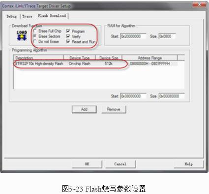 设置好了Debug选项卡中有关选项后还需要设置Flash Download选项卡,如图17所示。本选项卡主要设置烧写Flash时的相关参数,这里主要设置两个部分,一个是设置程序下载的一些配置,这儿选择Erase Sectors表示下载程序的时候擦除对应分区,勾选后面三项,分别表示下载程序,下载后校验,程序下载后复位并运行。接下来需要选择所使用的Flash,点击Add,添加所使用的芯片类型,笔者使用的是STM32F103ZET6,Flash大小是512k,因此选择STM32F10X High-density Flash。至此完成使用J-Link完成程序调试的配置。
