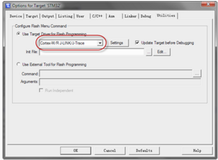 最后选择程序下载按钮所对应的工具配置,配置同Debug界面如图18所示,同样选择Cortex-M/R J-LINK/J-Trace这样就可以在后面的使用中一键将程序下载到Flash中。至此已经全部完成了程序调试和下载的必要设置。