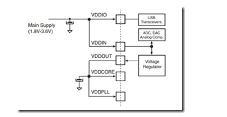 请您不要奇怪,等你看了AT91SAM3S4C的数据手册电源部分的时候你就懂了,AT91SAM3S4C内部自带了电源调节模块,其结果如下图所示。所以您如有疑问,请详细阅读数据手册。