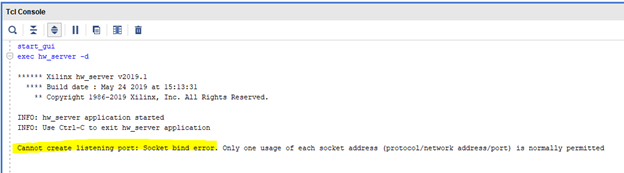 以下是先前共享实例仍在运行的情况下启动新的本地 hw_server 时可能出现的错误示例。