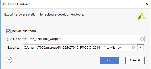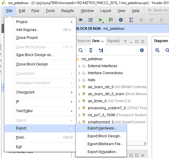 在MicroZed 2019.1 BSP下载MicroZed的Petalinux BSP。解压后,使用Vivado 2019.2 打开其中的硬件工程,升级所有IP,然后编译工程。为了测试,也可以在BD设计中,添加AXI timer,AXI BRAM等IP。成功编译工程后,导出硬件设计文件mz_petalinux_wrapper.xsa。在2019.2使用了新的硬件设计文件格式,也就是XSA文件。