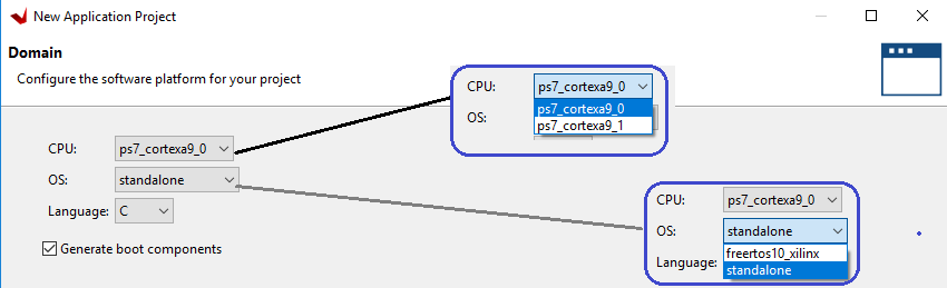之前只是简单的Hello world工程。下面创建更复杂的FreeRTOS LWIP TCP iPerf server. 在Domain界面,为OS选择FreeRTOS。