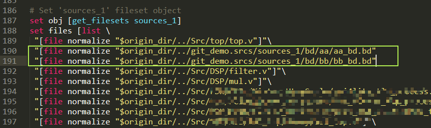 第二处需要更改的是删除files list中的bd文件信息,如下图中框起来的部分,这部分内容是将文件添加到工程中,但此时我们的bd文件还没有生成,因此这两个要删掉。bd文件是我们通过后面的tcl脚本添加进来的。